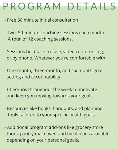Over the course of your program, we’ll meet twice a month to discuss your current struggles, set goals, and apply simple and sustainable changes to your daily routine. We take a holistic approach to your health by looking at imbalances in your life that could be causing unhealthy habits or behaviors. Areas such as nutrition, sleep quality, lifestyle, movement, relationships, stress, or anything else in between that can impact your health may come up during sessions.